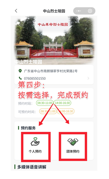 2.搜索“中山市退役军人就业创业联盟平台”微信小程序进入 → 点击【场馆预约】 → 选择中山革命烈士陵园 → 完成预约。