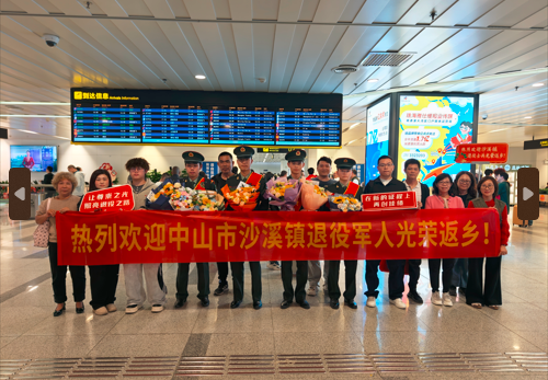 “热烈欢迎中山市退役士兵光荣回乡”红色欢迎牌在广州白云机场、深圳宝安机场、珠海金湾机场到达大厅格外醒目。在城轨中山站、中山北站、小榄站出站口,“欢迎退役士兵光荣返乡”的手持牌和横幅随处可见,现场洋溢着尊崇与温情。伴随着列车抵达、航班降落,身着戎装、胸戴红花的退役士兵陆续到达,等候的退役军人事务部门工作人员、志愿者与家属代表立即上前,用鲜花、掌声、问候声和欢呼声迎接新时代最可爱的人。