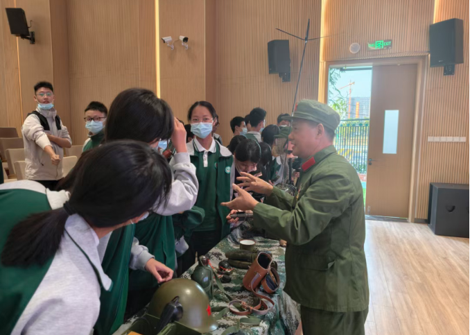 如果说宣讲是精神的洗礼,那么随后的互动环节则是一次零距离的震撼。全国“敬老爱老助老模范人物”、参战老兵朱长恩和战友杨雄标带来的军旅物品展,成为了最生动的“第二课堂”。同学们围在长桌旁,好奇地观看着这些承载着历史印记的“老物件”,并向老兵踊跃提问。抽象的国防概念化为了具象的家国情怀,在少年们的心中悄然扎根。
